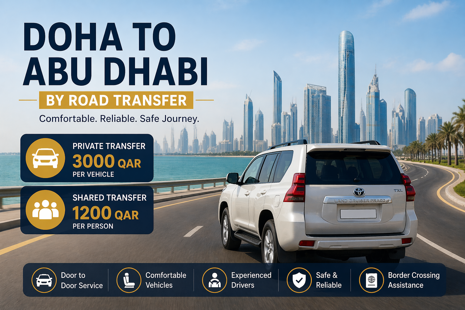 Comfortable cross-border transport from Doha to Dubai and Abu Dhabi with door-to-door pickup.