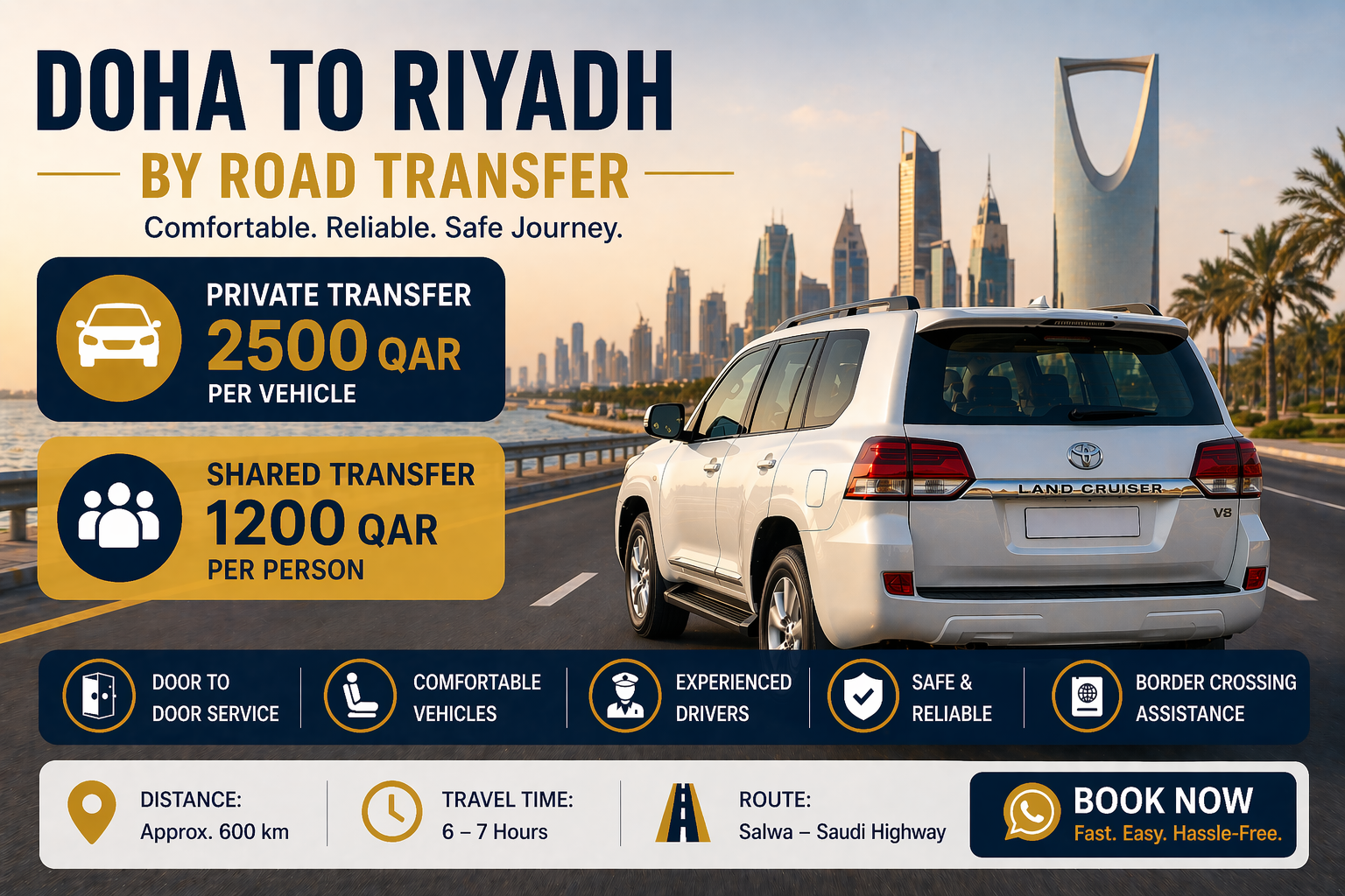 Daily road transfers from Doha to Riyadh, Dammam, Al Khobar, and other Saudi cities with experienced drivers.