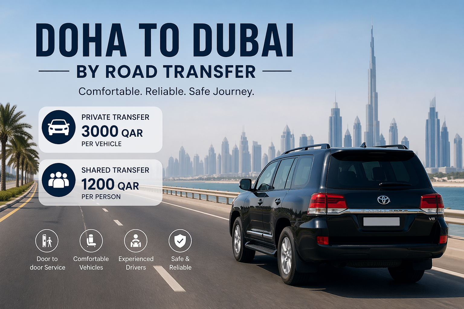 Premium intercity transfer service from Doha to Dubai with professional drivers, modern vehicles, and maximum comfort.